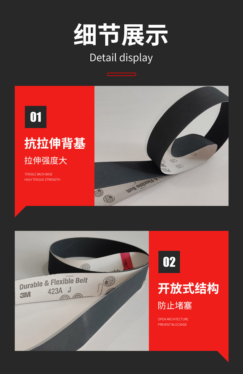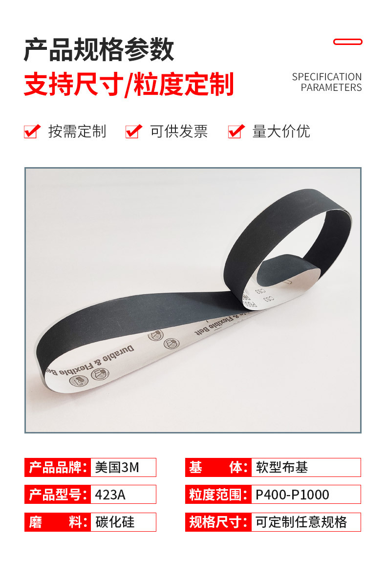 3M 423A是一款重型研磨砂带,有卓越的耐用性和高效的磨削性能,极高的材料去除率和抗堵塞耐热性,适用于多种金属的磨削,包括碳钢、不锈钢、合金钢、铸件、焊缝清理等。通常用于大型固定式或手提式砂带机等。
