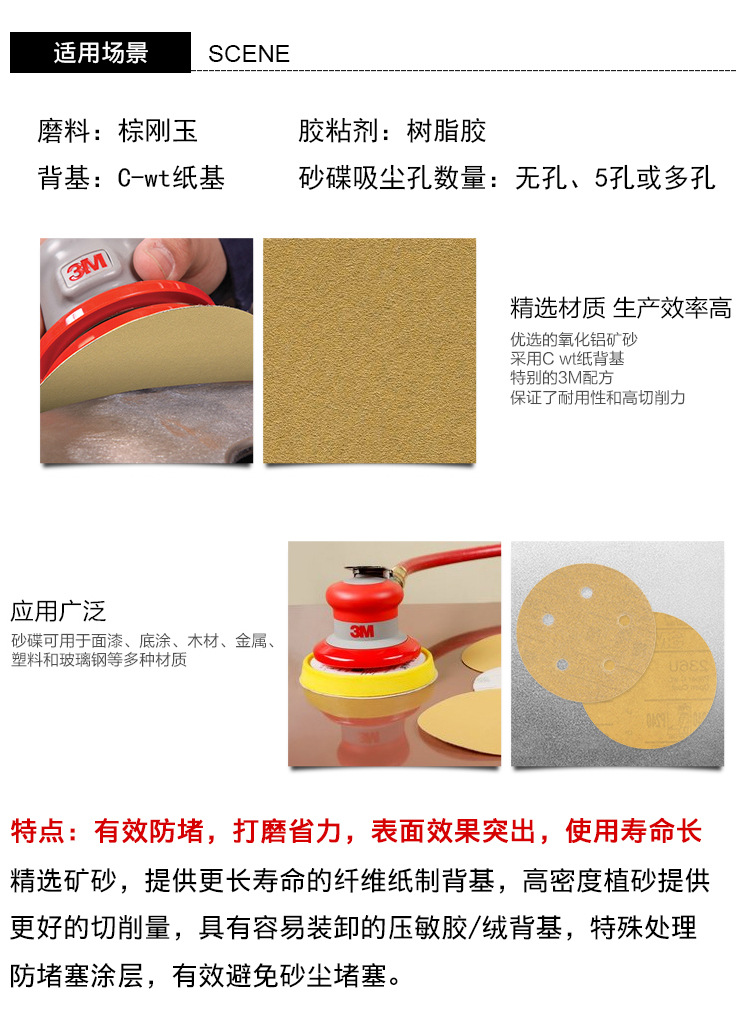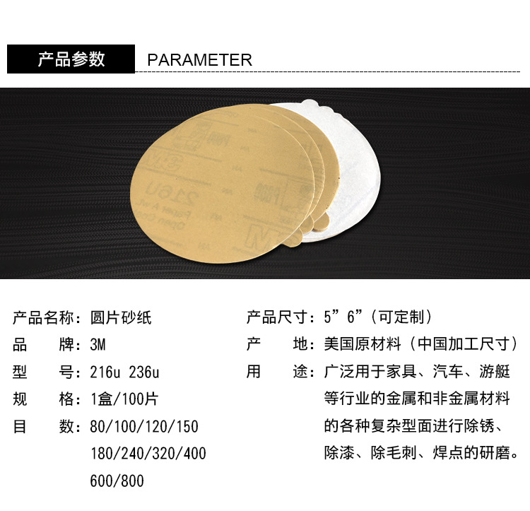 216U砂纸碟采用氧化铝制造,配以轻质纸背胶,适于与随机轨道砂光机配合用于木材、底漆、涂漆、密封层、面漆、玻璃纤维以及塑料的加工应用。疏植砂与防堵塞涂层可防止砂碟堵塞,从而增强切削效果以及砂碟使用寿命。