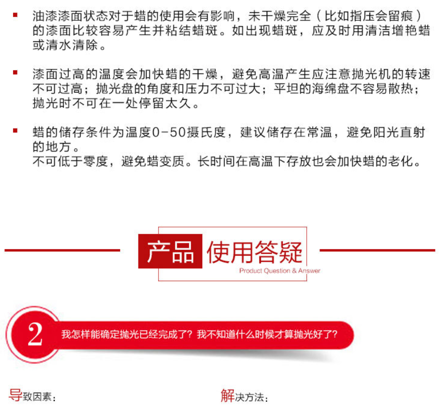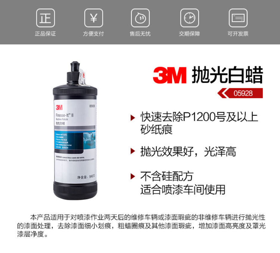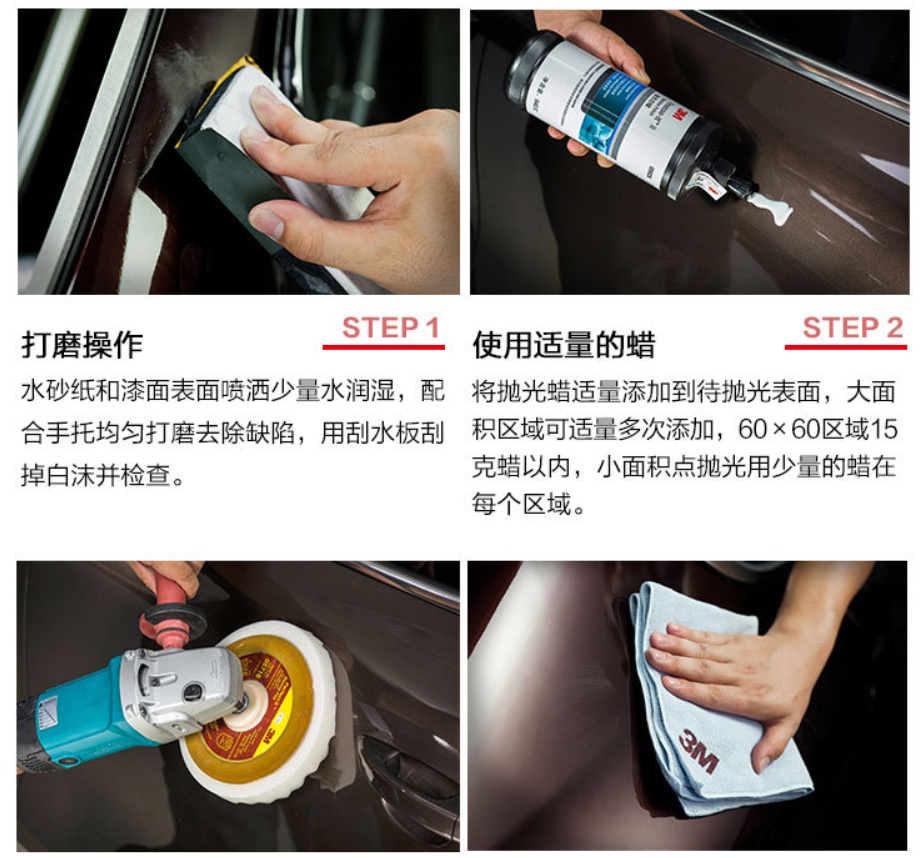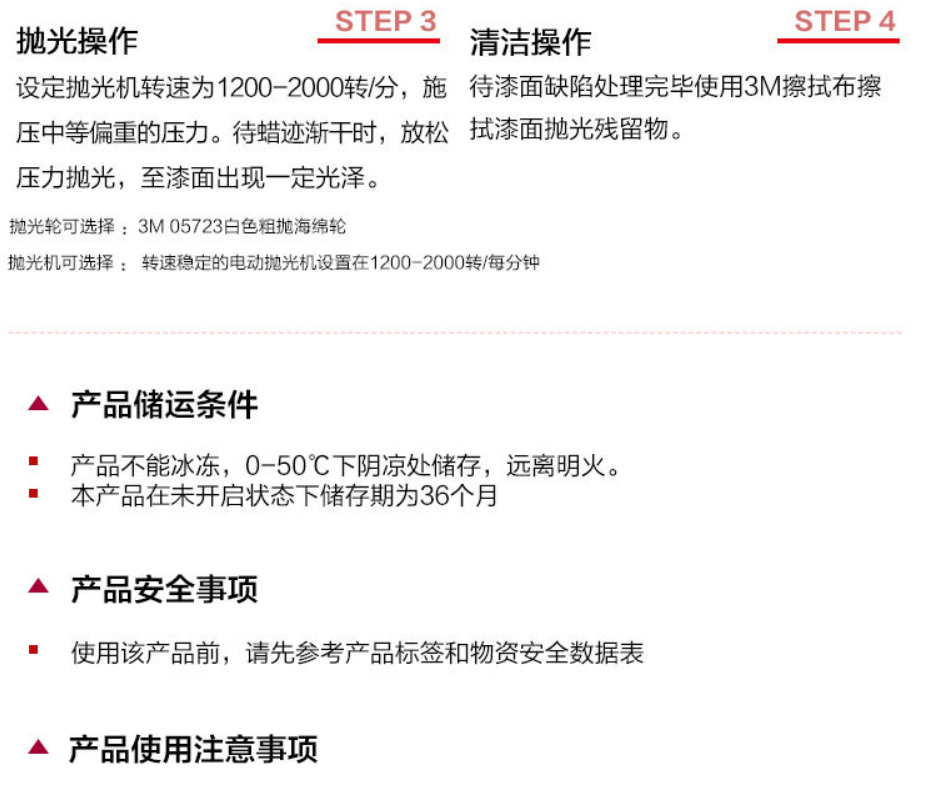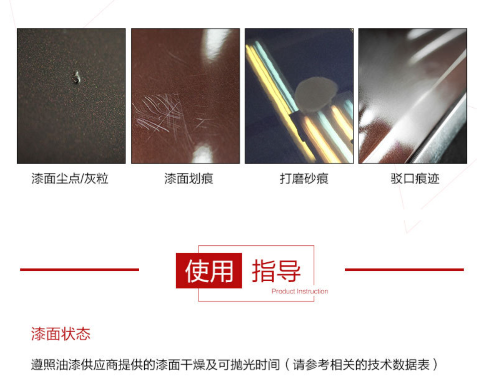 适用于对喷漆作业两天后的维修车辆或漆面有瑕疵的非维修车辆进行抛光性的漆面处理,去除漆面细小划痕、粗蜡圈痕及其它漆面瑕疵,增加漆面高亮度及罩光漆层净度