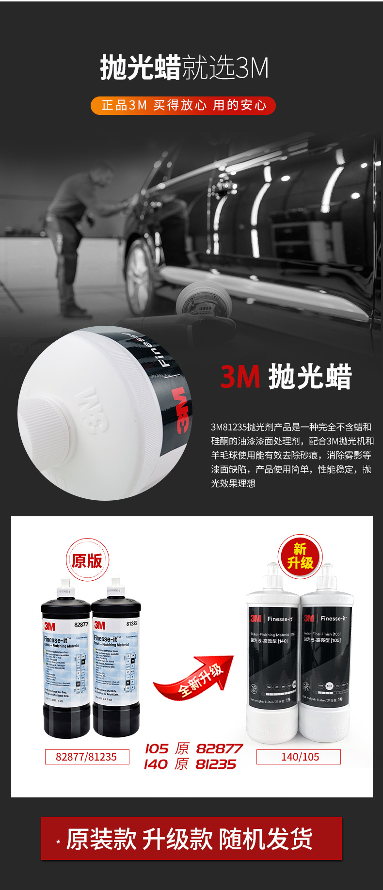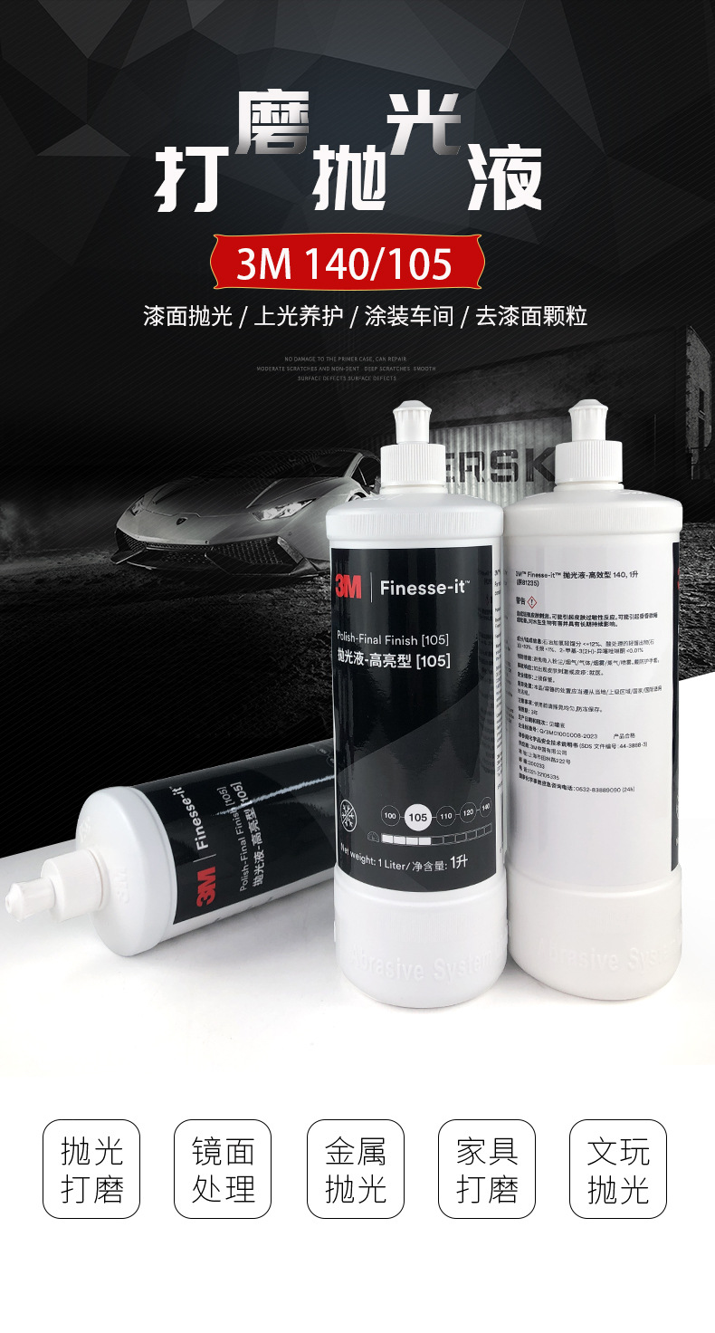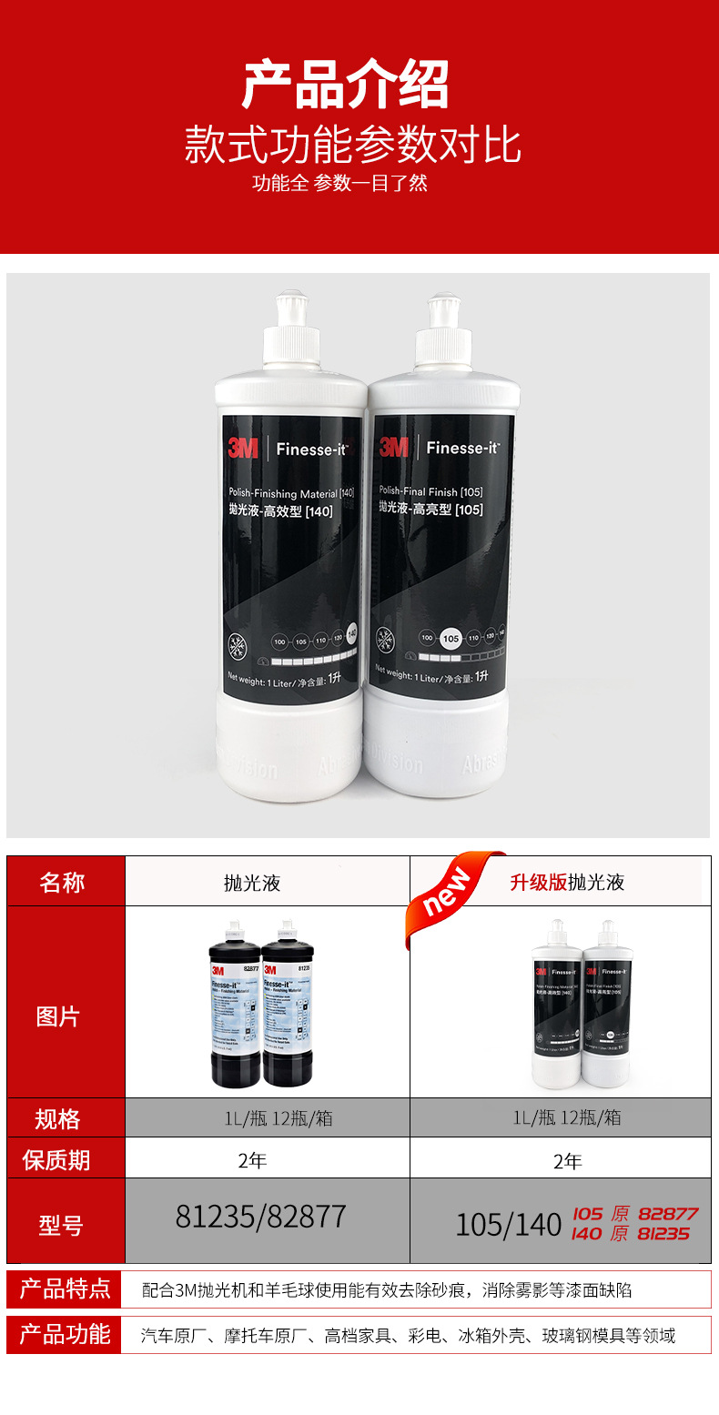 3M81235抛光剂产品是一种完全不含蜡和硅酮的油漆漆面处理剂,配合3M抛光机和羊毛球使用能有效去除砂痕,消除雾影等漆面缺陷,产品使用简单,性能稳定,抛光效果理想